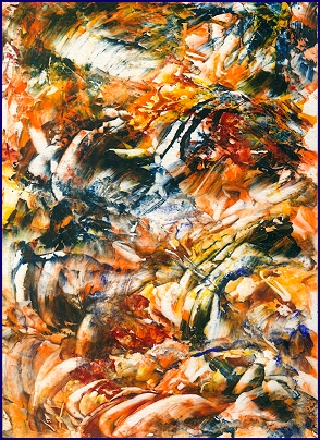 In diesem Bild verdichtet sich ein intensiv bewegter Wahrnehmungsraum zu einer kraftvollen Erfahrung von Energie, Wandlung und innerer Dynamik. Die Schichtung aus warmen Orange-, Ocker- und Erdnuancen trifft auf kontrastierende dunkle und helle Impulse, sodass eine Spannung entsteht, die weniger eine Szene abbildet als vielmehr ein Zustandsfeld des Werdens erfahrbar macht.