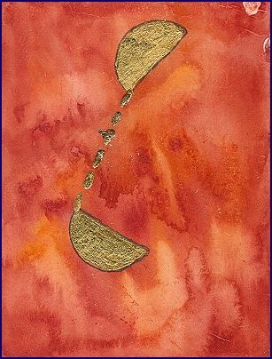 Dieses Werk ist ein kraftvolles Sinnbild für das Unsichtbare, das alles Leben durchdringt. Auf dem leuchtend warmen Grund aus tiefem Rot und vibrierendem Orange entfaltet sich eine Energie, die zugleich irdisch und himmlisch wirkt. Aus der Tiefe des Farbraums erheben sich goldene Formen, wie zwei Pole, die einander anziehen und ein Feld lebendiger Schwingung erzeugen. Zwischen ihnen fließt eine zarte Spur aus Gold, ein Strom der Einheit, der die Trennung überwindet und das Dazwischen zum Ort der Wandlung erhebt.