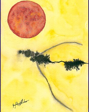 In dieses Feld tritt die rote Kreisform wie ein pulsierender Fixpunkt. Sie ist nicht nur Sonne, nicht nur Planet, sie erscheint wie ein Bewusstseinskern, ein energetischer Mittelpunkt, der Präsenz behauptet. Das Rot glüht gegen das Gelb, und in dieser Spannung entsteht ein leiser, aber spürbarer Dialog zwischen Lebenskraft und Weite.