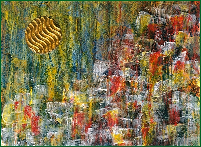 Acryl, Goldkarton und Acrylpaste auf Aquarellbütten ca 15 x 21 cm