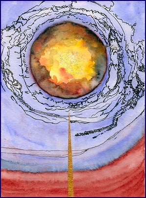 Umgeben ist dieses Zentrum von kreisenden, fast sturmbewegten Linien in Tusche, die wie atmosphärische Strömungen wirken. Sie erinnern an kosmische Winde, an Energiefelder, an die unsichtbaren Dynamiken des Lebens. Diese Linien sind nicht dekorativ, sie erzählen von Bewegung, von Reibung, von Verdichtung. Sie machen sichtbar, dass Schöpfung kein stiller Akt ist, sondern ein Prozess voller Spannung und Transformation.