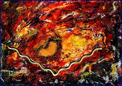 Das Gold entfaltet hier seine tiefere Bedeutung: Es ist nicht bloß Farbe, sondern ein Symbol des Wesentlichen, des Unvergänglichen, des reinen Seins. Umgeben von eruptiven Rot- und Schwarztönen entsteht der Eindruck eines kosmischen Ursprungsraumes, eines Ortes zwischen Chaos und Ordnung, zwischen Auflösung und Geburt. Die dunkleren Zonen wirken wie Schichten des Vergessens oder der Erinnerung, während das Licht sich seinen Weg bahnt, unbeirrbar, kraftvoll, wahr.
