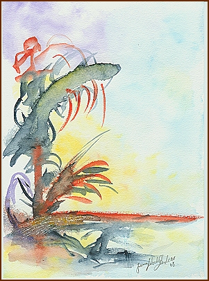 Das Aquarell  ist eine Schwelle. Eine Einladung, das Sichtbare zu verlassen und in jene stille Zone einzutreten, in der Träume noch nachklingen und das Leben gerade erst zu atmen beginnt. Auf zartem Aquarellpapier entfaltet sich ein Spiel aus sanftem Gelb, transparentem Blau und leuchtendem Rot, das den Moment einfängt, in dem das erste Licht die Dunkelheit berührt, wie eine Erinnerung an etwas längst Gewusstes, das tief in uns wieder aufwacht.
