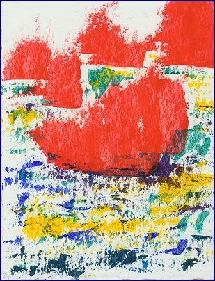 Dieses Bild wirkt wie eine offene alchemistische Kammer, in der sich ein innerer Prozess sichtbar gemacht hat. Aus der Tiefe eines vielschichtig aufgebauten Grundes erhebt sich ein intensives Rot, nicht dekorativ, sondern zwingend, fast notwendig. Es ist kein oberflächliches Rot, sondern ein Seelenrot, verdichtet, gereift, durch Widerstand gegangen. Die darunterliegenden Schichten aus Blau, Gelb, Grün und Weiß erinnern an Sedimente von Erfahrung, an Zeit, Bewegung und Wandlung. Sie tragen das Geschehen, ohne es zu kontrollieren.