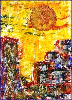 Die Oberfläche wirkt schwer und trocken, wie eine Betonlandschaft, die den ganzen Tag Sonne gespeichert hat. Staub liegt nicht nur auf der Landschaft, er scheint Teil von ihr geworden zu sein. Nichts weht davon, nichts löst sich auf. Alles bleibt. Die Schichten aus Acryl und Paste wirken wie abgelagerte Zeit, wie Sedimente eines langen, unbewegten Tages. Hier wurde nichts geglättet, nichts beschönigt, die Rauheit ist Programm.