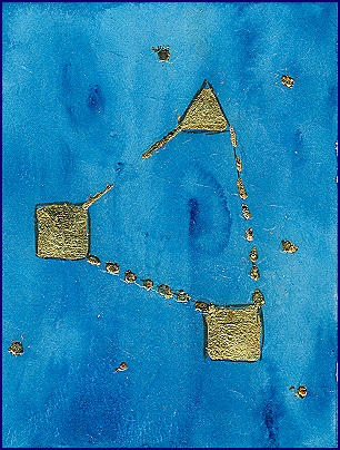 In diesem Bild entfaltet sich eine stille, doch unwiderstehlich kraftvolle Metapher für die innere Reise des Menschen. Auf tiefblauem Grund, der an die unendliche Weite von Himmel, Meer oder Bewusstsein erinnert, treten drei goldene Formen hervor: ein Quadrat, ein weiteres Quadrat und ein Dreieck, verbunden durch eine Reihe punktierter Linien. Diese Linien wirken wie Spuren eines Weges, wie feine Markierungen, die zeigen, dass Erkenntnis nicht in Sprüngen geschieht, sondern in leisen, tastenden Schritten, die sich zu einer Bewegung des Geistes verdichten.