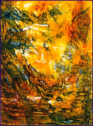 Dieses Bild ist ein inneres Ereignis, ein Moment des Erwachens, eingefangen in Farbe und Struktur. Schon beim ersten Blick breitet sich eine aufgeladene, fast heilige Atmosphäre aus: goldene Ströme von Licht scheinen sich ihren Weg durch schattige Tiefen zu bahnen, als ob das Bild selbst atmet, pulsiert und sich erinnert.