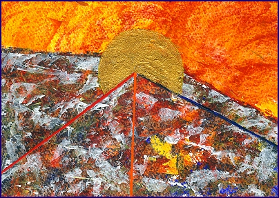 Die leuchtend intensive, fast glühende Farbfläche im oberen Bereich wirkt wie ein kosmisches Feuer, das nicht zerstört, sondern verwandelt. Es ist kein sanftes Morgenlicht, es ist ein brennendes Erwachen, ein Licht, das fordert, nicht tröstet. Darunter liegt eine raue, strukturierte Landschaft, die an Bruchstücke, Narben und gelebte Erfahrung erinnert. Hier ist nichts glatt, nichts idealisiert, alles spricht von Reibung, Widerstand und geformter Existenz.