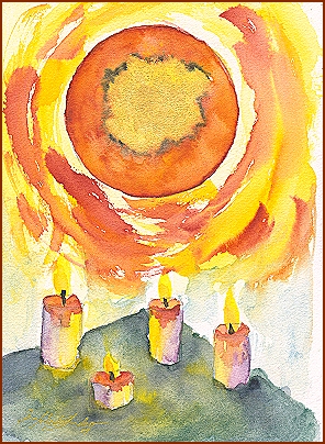 Die Spannung zwischen dem großen Lichtfeld oben und den einzelnen Flammen unten ist der eigentliche Kern des Bildes. Es ist die Spannung zwischen Quelle und Ausdruck, zwischen Ursprung und Handlung, zwischen dem, was größer ist als wir, und dem, was wir konkret verkörpern. Nichts wird erklärt, nichts aufgelöst. Das Bild vertraut darauf, dass Bedeutung nicht geliefert, sondern entdeckt wird.