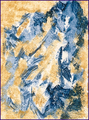 Die Atmosphäre oszilliert zwischen ruhig und dramatisch – ein Spannungsfeld, das den Betrachter hineinzieht und nicht mehr loslässt. Die goldenen, erdigen Strukturen wirken wie ein Boden, ein Halt, während die kräftigen Blautöne sich wie Erinnerungsströme darüberlegen, geheimnisvoll, voller Energie und Tiefe.