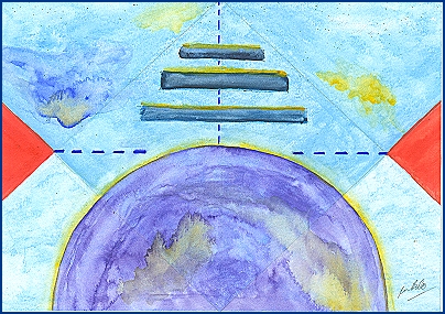 Im Zentrum steht eine halbkreisförmige Form, ein konzentrierter Energiekern, der wirkt wie der Ursprung eines gesamten Systems. Von ihm aus breitet sich eine feine Spannung aus, eine Spannung, die zugleich ruht und strahlt. Darüber liegen horizontale Ebenen, klar definiert wie gedankliche Plattformen, auf denen das Auge Halt findet. Sie bilden rhythmische Übergänge, Stufen der Wahrnehmung, als würde das Bild selbst die Bewegung vom Inneren zum Höheren strukturieren.