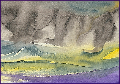 Die grauen Schleier, die sich wie ferne Berge auftürmen, sind keine Landschaft. Sie sind Erinnerungen, Gedanken, Schatten des Gestern, die sich langsam in Bewegung setzen. Unter ihnen bricht ein Licht hervor, ein leises Versprechen von Neubeginn, flirrend, noch unsicher, aber unaufhaltsam. Das Violett am unteren Rand scheint zu flüstern: „Nur wer durch das Dunkel geht, kann die Farben dahinter sehen.“