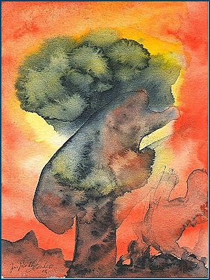 Dieses Aquarell öffnet einen Raum in eine Welt, in der Feuer und Stille, Vergänglichkeit und Unendlichkeit miteinander verschmelzen. Im ersten Blick scheint es, als würde sich die Natur selbst entzünden, ein glühender Horizont, aus dem sich ein Baum erhebt, dessen Krone zwischen Licht und Schatten atmet. Doch wer länger schaut, spürt, dass hier kein Feuer der Zerstörung lodert, sondern das innere Leuchten des Lebens.