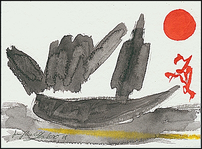 Dieses Bild entfaltet die Atmosphäre eines existentiellen Aufbruchs: Ein dunkles, schiffsgleiches Gebilde liegt wie eine schweigende Schwelle zwischen Vergangenheit und Zukunft, darüber erhebt sich eine mächtige rote Sonne, die zugleich Gefahr, Verheißung und Verwandlung symbolisiert.