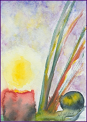 In diesem Aquarell entfaltet sich der Moment, in dem der Tag seinen ersten Atemzug nimmt, ein leiser, fast heiliger Augenblick, der zwischen Licht und Erwartung schwebt. Der warme, gelbe Kreis, der sich sanft aus dem Nebel hebt, wirkt wie eine Geburt des Lichts, eine Sonne, die nicht nur den Horizont berührt, sondern auch das Innere des Betrachters. Sie scheint nicht zu brennen, sondern zu glühen, als würde sie ihre Wärme aus einer tiefen, inneren Quelle beziehen.
