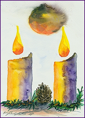 In diesem Aquarell entfaltet sich eine stille, doch kraftvolle Szenerie, in der zwei gebrochene Kerzen wie innere Leuchttürme stehen, nicht perfekt, nicht symmetrisch, aber dennoch voller Präsenz. Die Flammen erheben sich über ihre verletzten Körper, als wollten sie sagen, dass Licht nicht aus der Unversehrtheit entsteht, sondern aus der Entscheidung, weiter zu brennen. Zwischen ihnen ruht ein kleiner Tannenzapfen, ein Symbol des Werdens, der Möglichkeit, des noch Unentfalteten. Er ist unscheinbar und doch bedeutungsschwer, denn er verkörpert das Potenzial des Lebens, selbst im tiefsten Winter verborgen zu keimen. Über der Szene schwebt ein rundes, glühendes Himmelslicht, das wie eine Erinnerung wirkt: Alles ist verbunden, das Irdische, das Vergängliche und das Himmlische, das uns führt. Die Farbübergänge aus Gold, Purpur und sanften Grüntönen erzählen von Wärme, Spiritualität und Naturkraft, die sich nicht gegenseitig ausschließen, sondern einander durchdringen. Dieses Bild lädt dazu ein, den eigenen inneren Advent zu spüren, jenes geduldige Erwarten, jene leise Hoffnung, die im Dunkel glimmt und sich jeden Tag neu entzünden lässt.