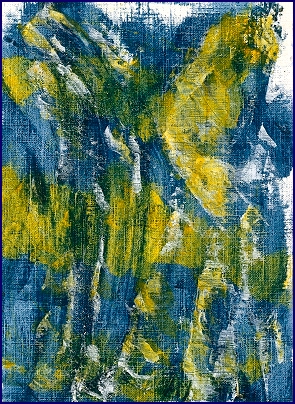 Dieses Bild entfaltet sich wie ein kosmisches Echo, das tief im Innersten des Betrachters widerhallt. Die vibrierenden Blautöne wirken wie Schichten eines Urnebels, die sich öffnen, um das Dahinterliegende sichtbar zu machen.  Ein Raum, in dem Zeit nicht linear verläuft, sondern pulsiert. Dazwischen brechen kraftvolle Gelb- und Goldimpulse hervor, als würden Lichtkeime aus einer noch unberührten Dimension in die stoffliche Welt dringen.