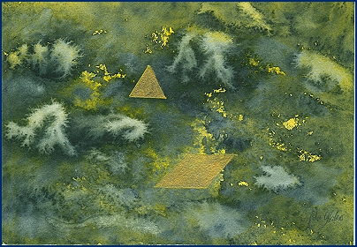 Ein Werk, das sich wie ein stiller Atemzug zwischen Traum und Wirklichkeit entfaltet. In diesem Bild begegnen sich Licht und Nebel, Form und Auflösung, Materie und Geist in einem leisen, vibrierenden Gleichgewicht. Die weichen, grünen und ockerfarbenen Flächen scheinen zu fließen, als würde sich der Raum selbst in Bewegung befinden. Dazwischen leuchten geometrische Formen in Gold, klar und ruhig, wie uralte Zeichen einer höheren Ordnung. Sie wirken, als wären sie Botschaften aus einer tieferen Ebene des Bewusstseins, die sich nur jenen offenbaren, die bereit sind, zwischen den Schleiern zu sehen.