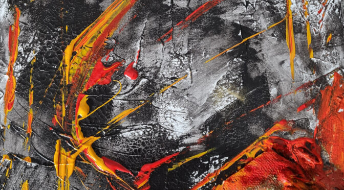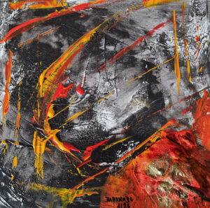 Dieses Werk ist ein Schlag in das Bewusstsein. Eine visuelle Verdichtung von Krieg und Frieden, nicht erzählt, sondern körperlich spürbar gemacht. Die dunklen, aufgerissenen Flächen wirken wie eine verwundete Erde, wie Mauern, die zu lange unter Druck standen und nun ihre Geschichte preisgeben. In diese Schwere schneiden rote und gelbe Linien wie Sirenen durch Rauch, wie Marschrhythmen, wie das unaufhaltsame Vorrücken einer Macht, die keinen Dialog kennt. Nichts hier ist zufällig weich: Jeder Farbausbruch ist ein Akt, jede Spur ein Zeugnis von Widerstand.