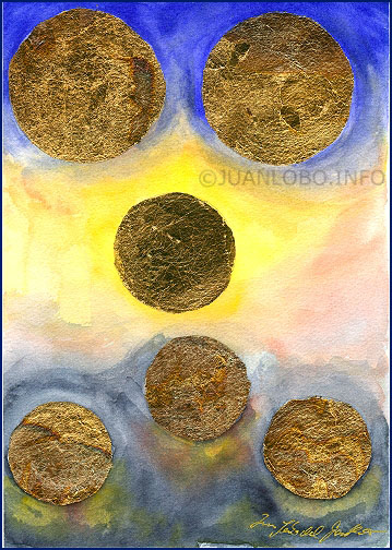 Remastert Morgenbild 6. Januar 2009 Freitag, 6. Januar 2012 JUANLOBO Das Morgenbild zum 6. Januar “Die Sechs Münzen im Tarot” “The Six Coins in the Tarot” “Las seis monedas en el tarot” Aquarell, Schlagmetall auf Aquarellbütten ca 15 x 21,5 cm Teile diesen Beitrag