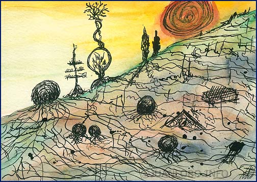Morgenbild Morgenbild 8. September 2011 Donnerstag, 8. September 2011 JUANLOBO Morgenbild vom 08. September “Es gibt keine Glühbirnenfelder mehr” “There are no more fields of light bulbs” “No hay más campos de bombillas” Aquarell, Tusche, Goldpaste auf Aquarellbütten ca. 15 x 21 cm Teile diesen Beitrag