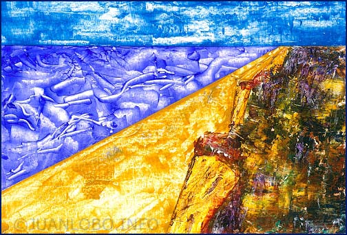 Über dieser Schwelle liegt ein violett schimmernder Kosmos, feinkörnig, glitzernd, fast trancehaft. Er öffnet den Raum ins Unbewusste, ins Visionäre, als würde das Bild selbst einen Atemzug zwischen Welten halten. Im unteren Bereich hingegen glüht ein erdiges Rot, warm, schwer, archaisch. Es verankert das Geschehen, gibt ihm Körper, Gravitation, Herkunft.