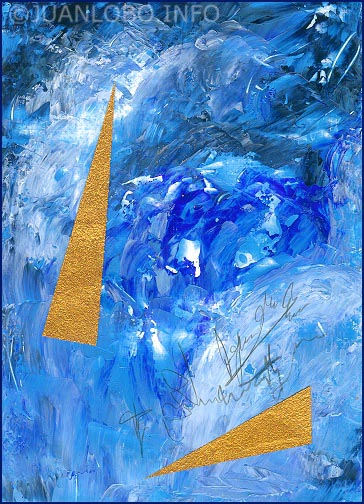 Schon beim ersten Blick entfaltet es eine Sogwirkung, die sich kaum in Worte fassen lässt. Das tiefe Spiel aus kobaltblauen, türkisfarbenen und weißen Strömungen erinnert an eine aufgewühlte Wasseroberfläche, an das ewige Kommen und Gehen der Gezeiten, an das lebendige Rauschen der Gedankenwelt. Zwei goldene Dreiecke durchbrechen diese Wogen, wie Signale, wie Orientierungspunkte, wie Strahlen von Klarheit im Ozean des Unbewussten.