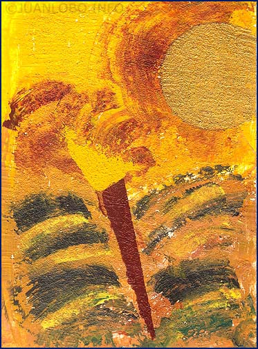 In leuchtenden Schichten aus Acryl, Acrylpaste und Quarzsand entfaltet sich ein Spiel von Textur und Strahlkraft. Die Sonne -übergroß, pulsierend, fast greifbar – taucht die Landschaft in ein Bad aus Gold, Ocker und Rotbraun. Ihre Wärme scheint die Farben von innen heraus zu entzünden. Man spürt beinahe den Duft reifer Felder, das Flirren in der Luft, den letzten Tanz der Schmetterlinge.