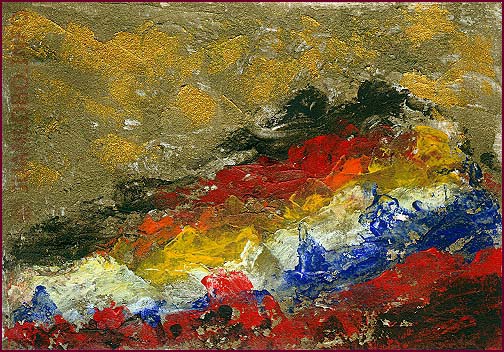 Emotionen wie Beklemmung, Stolz, Wut und Nachdenklichkeit verschmelzen. Die Farben wirken nicht geordnet, sondern zerrieben, verschoben, bedroht, als ob das Ideal einer Nation im Mahlwerk globaler Kräfte seine Reinheit verliert.