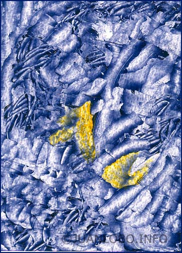 Wie ein Gedanke, der sich durch Schichten aus Gewohnheit, Nachahmung und Trägheit hindurchbohrt, arbeitet sich das Gelb – Symbol für Bewusstsein, Klarheit und Intelligenz – an der bleiern-blauen Masse ab. Diese steht für das kollektive Denken im Halbschlaf, für Meinungen, die wiedergekäut werden, ohne je wirklich durchdrungen zu sein. Und genau hier beginnt die Mini-Erzählung, die das Bild in sich trägt: