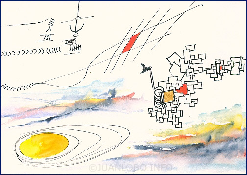 Im rechten Teil verdichtet sich das Bild: kantige Formen, die an Häuser, Systeme, Strukturen erinnern, eine fast mechanische Verdrahtung. Dazwischen ein rotes Quadrat:  das Signal der Entscheidung, der Impuls des Neuen, der sich in das starre System einschreibt. Es ist der Moment, in dem die Idee das starre Gefüge durchbricht, in dem das scheinbar Unmögliche plötzlich eine klare Form annimmt. Genau hier steckt die Essenz des „Ei des Kolumbus“: die Genialität, im Einfachen das Revolutionäre zu erkennen.