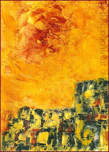 Die Atmosphäre ist aufwühlend und zugleich meditativ. Sie trägt das Versprechen eines Tages, der sich neigt, und die Vorahnung einer Nacht, die voller Geheimnisse sein wird. Der untere Bildbereich, die kantigen, fast architektonisch wirkenden Strukturen, wirken wie eine uralte Stadt, in die das Licht des Abends fällt. Zwischen Stein und Glut entsteht ein Dialog von Beständigkeit und Vergänglichkeit.