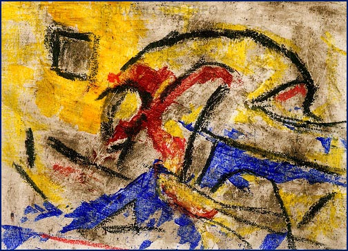 In diesem Werk pulsieren die Kräfte eines inneren Wendepunkts. Die eruptiven Rotnuancen im Zentrum wirken wie ein Herzschlag, der sich gegen alte Begrenzungen aufbäumt, ein Akt des Aufbrechens, der nicht mehr aufzuhalten ist. Gelbe Lichtfelder drängen von links hinein, als würde ein neuer Horizont aufleuchten, ein Raum, der gesehen werden will. Das dunkle Rechteck im oberen Bereich erscheint wie ein fernes Tor, ein abstrahiertes Erinnerungsfragment, ein Symbol für jene Schwelle, die der Blick bereits überschreitet.