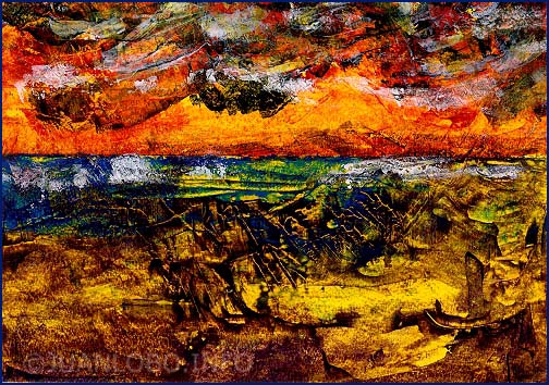 Der geschwungene, fast musikalisch anmutende Hauptakzent im Bild erinnert an eine Note oder ein Tor in ein anderes Empfinden. In ihm pulsiert die Wärme eines erwachenden Tages. Die grün-blauen Wellenformen auf der linken Seite kontrastieren mit der leuchtenden Mitte – als ob Natur und Empfindung in Dialog treten.