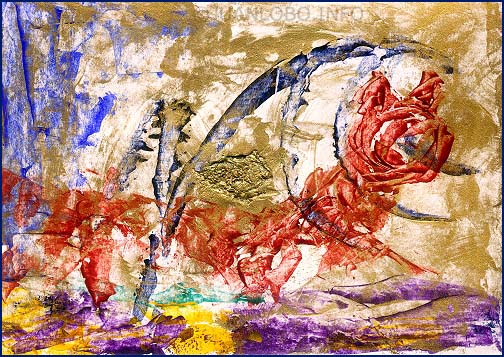 Die roten, pulsierenden Formen erinnern an etwas Animalisches, ein „blutiger Hund“, ein Symbol für jene rohen, archaischen Impulse, die wir lieber nicht sehen wollen und dennoch in uns tragen. Sie wirken zerrissen, aufgewühlt, als würden sie im gleichen Moment entstehen und vergehen. Schuldgefühle, das „Sündenbewusstsein“, scheinen sie zu formen und zugleich zu zerreißen. Zwischen ihnen und dem goldenen Schein entsteht ein nervöser Widerstreit: das Bedürfnis, rein zu wirken, und die Furcht, die eigene Wildheit zuzugeben.