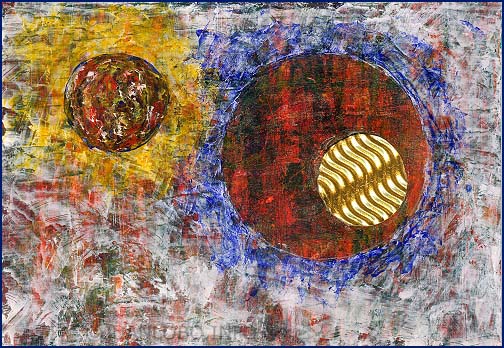 Ein Werk, das auf den ersten Blick die Anmutung eines kosmischen Tanzes trägt und zugleich eine tiefere, fast mystische Resonanz entfaltet. In kraftvollen Schichten aus Acryl und Acrylpaste entfaltet sich ein vibrierendes Spiel zwischen Licht und Schatten, Nähe und Ferne, Bewegung und Stille. Der Betrachter wird in ein Spannungsfeld hineingezogen, in dem sich zwei Himmelskörper gegenüberstehen, der eine in glühendem Gelb, pulsierend wie eine Sonne des inneren Feuers, der andere in erdig-roten und kobaltblauen Tönen, majestätisch, geheimnisvoll, umfangen vom Dunkel der Nacht.