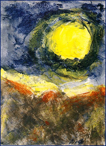 In diesem Bild entfaltet sich eine stille, urtümliche Kraft, die den Betrachter wie ein sanfter Sog in eine tiefere, innere Dimension zieht. Der Vollmond, leuchtend und klar wie ein inneres Feuer, thront im Zentrum. Seine intensiv gelbe Präsenz wirkt fast magnetisch,  ein Symbol für Erkenntnis, Bewusstwerdung und das Aufscheinen unverstellter Wahrheit. Er durchbricht das Dunkel nicht nur, er lädt es ein, sich in seinem Licht zu verwandeln.