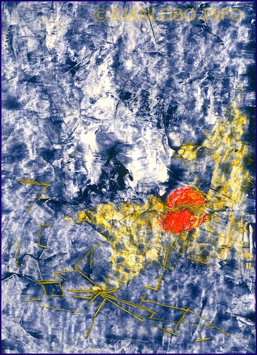 In diesem Bild entfaltet sich ein vielschichtiges Spannungsfeld zwischen kosmischer Tiefe und innerer Auflösung. Das kraftvolle Blau-Weiß des Hintergrunds wirkt wie eine aufgewühlte Raumzeit, ein vibrierendes Gewebe, das den Betrachter in jene Sphäre führt, in der Zeit nicht mehr linear, sondern vielschichtig, verwoben und unberechenbar erscheint. Die Struktur erinnert an nebulöse Galaxien, an das Rauschen des Universums, an jene geheimnisvolle Schicht der Realität, die wir ahnen, aber nie fassen können.